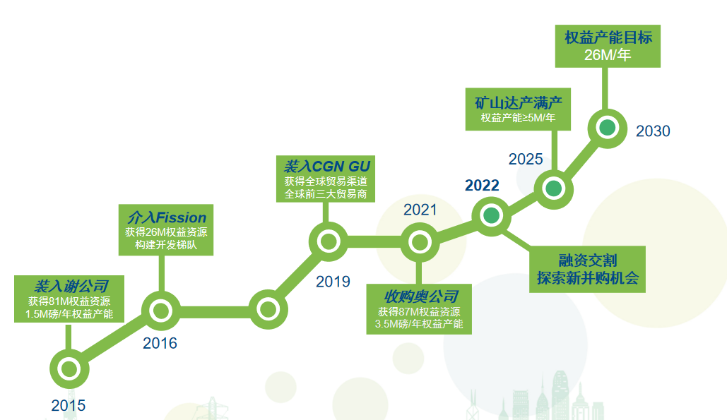 2015年,收購哈薩克斯坦謝米茲拜伊鈾公司49%股權,并獲得下轄兩座在運鈾礦49%的天然鈾產品包銷權。中廣核礦業成為一家主業清晰的鈾資源開發和貿易公司。