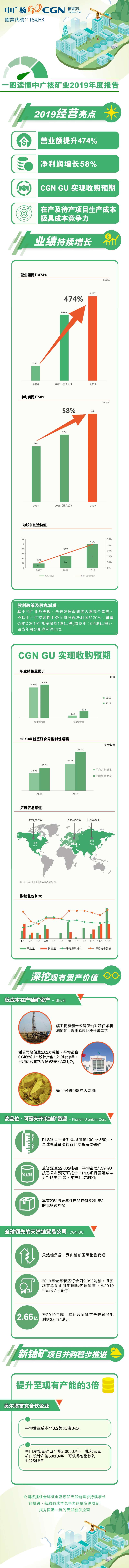 在報告期內,中廣核礦業實現營業額20.77億港元,較2018年重列后營業額增長28%;實現凈利潤1.6億港元,較2018年重列后凈利潤增長31%。公司營業額及利潤增長的主要受益于天然鈾銷量增加、下屬礦山業績增長和公司資金使用效率的提高。